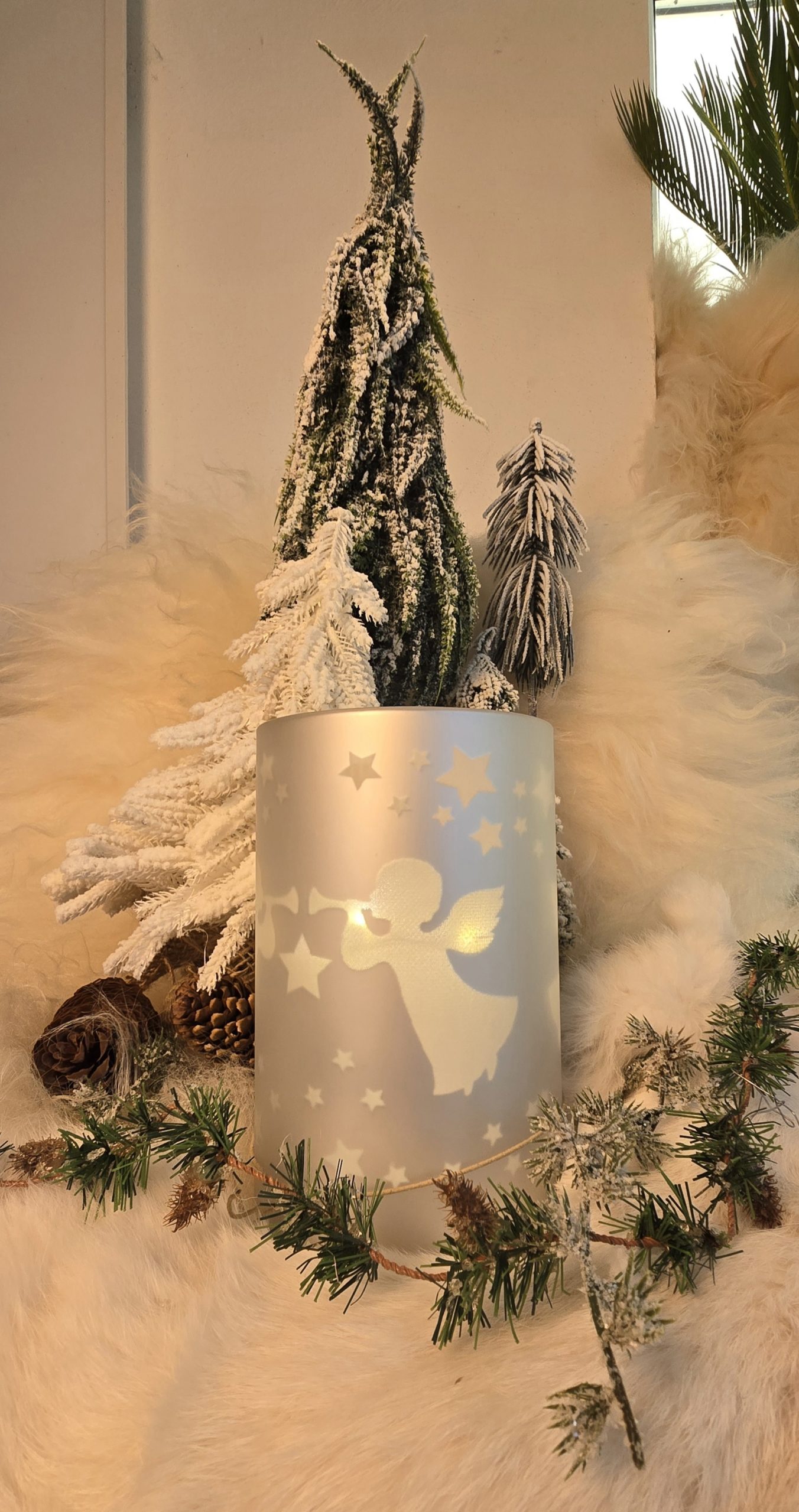 Diese Led Licht ist aus Glas hat als Motiv ein Engel und hat eine Timer Funktion.